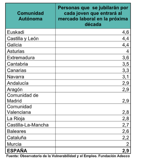 Por Comunidades Autónomas, 8 presentan una previsión de relevo generacional más desfavorable que la media nacional: Euskadi (4,6 personas que se jubilan por cada una que se incorporará al mercado laboral en la próxima década); Castilla y León (4,4); Galicia (4,4); Asturias (4); Extremadura (3,6); Cantabria (3,5); Canarias (3,3 ) y Navarra (3,1).
